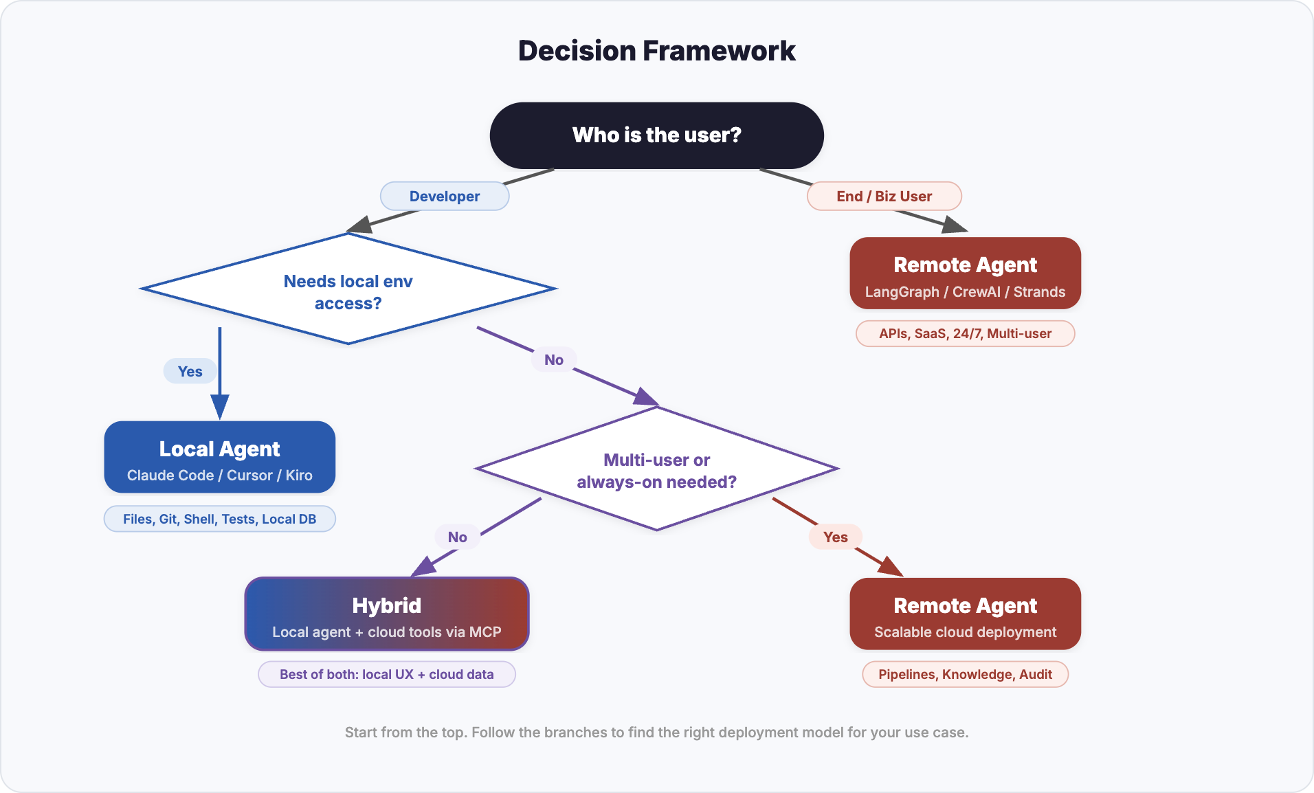The agent deployment decision is not about which approach is “better” — it is about matching the deployment model to the problem. Local agents give developers superpowers in their own environment. Remote agents bring AI capabilities to production systems and end users. The best architectures know when to use each — and increasingly, how to combine them.
