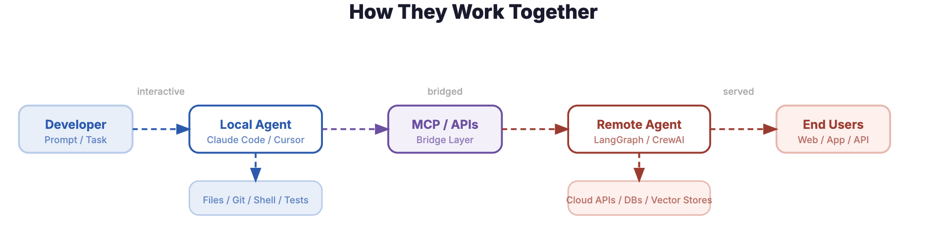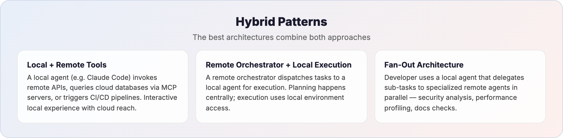 A local agent like Claude Code can invoke remote APIs, query cloud databases via MCP (Model Context Protocol) servers, or trigger CI/CD pipelines — combining the interactive local experience with access to remote infrastructure. The agent runs locally but its tools reach into the cloud.