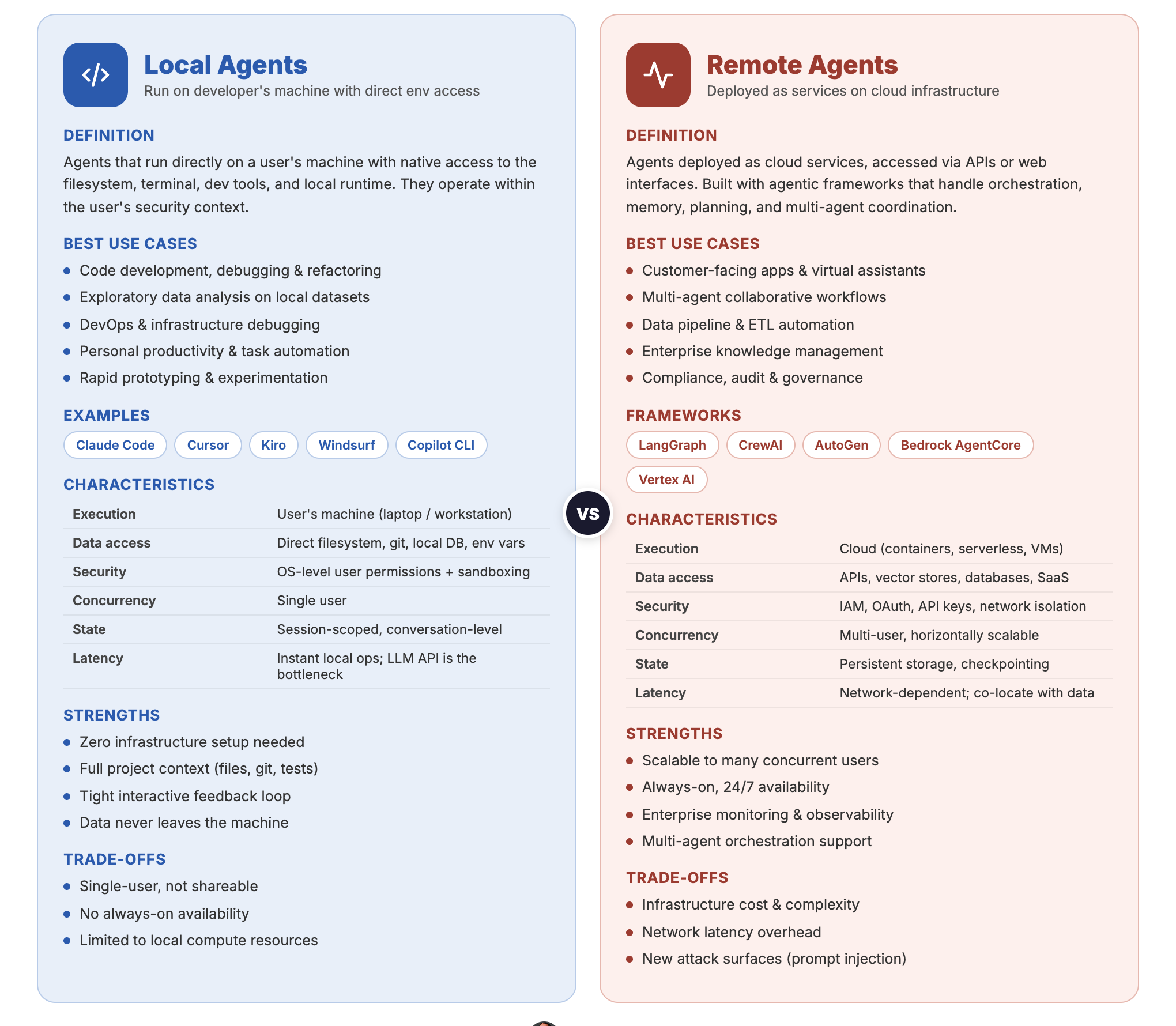 | Local Agent | Code development, debugging, prototyping, data exploration, personal automation | Claude Code, Kiro, Cursor |