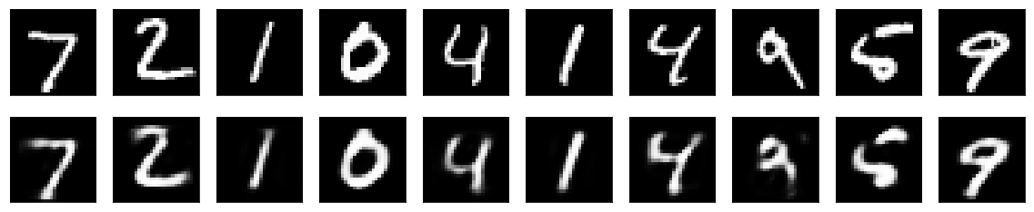 n =10 plt.figure(figsize=(20, 4)) for i in range(n): # original image ax = plt.subplot(2, n, i + 1) plt.imshow(x_test[i].reshape(28,28)) plt.gray() ax.get_xaxis().set_visible(False) ax.get_yaxis().set_visible(False) # Reconstructed image ax = plt.subplot(2, n, i + 1 + n) plt.imshow(decoded_imgs[i].reshape(28,28)) plt.gray() ax.get_xaxis().set_visible(False) ax.get_yaxis().set_visible(False) plt.show()